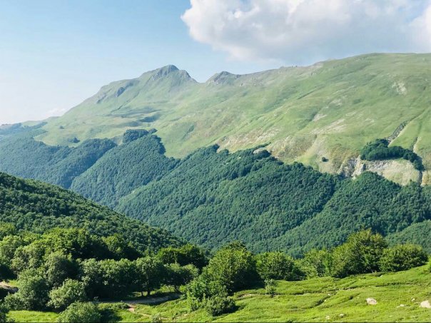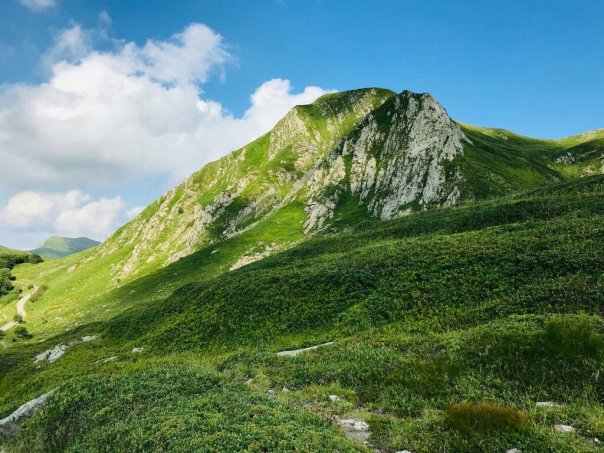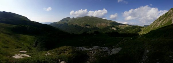 Intorno a me morbide curve verde brillante, di fianco la roccia del monte Prado che risalta con i suoi chiaro scuri in contrasto al cielo azzurro.