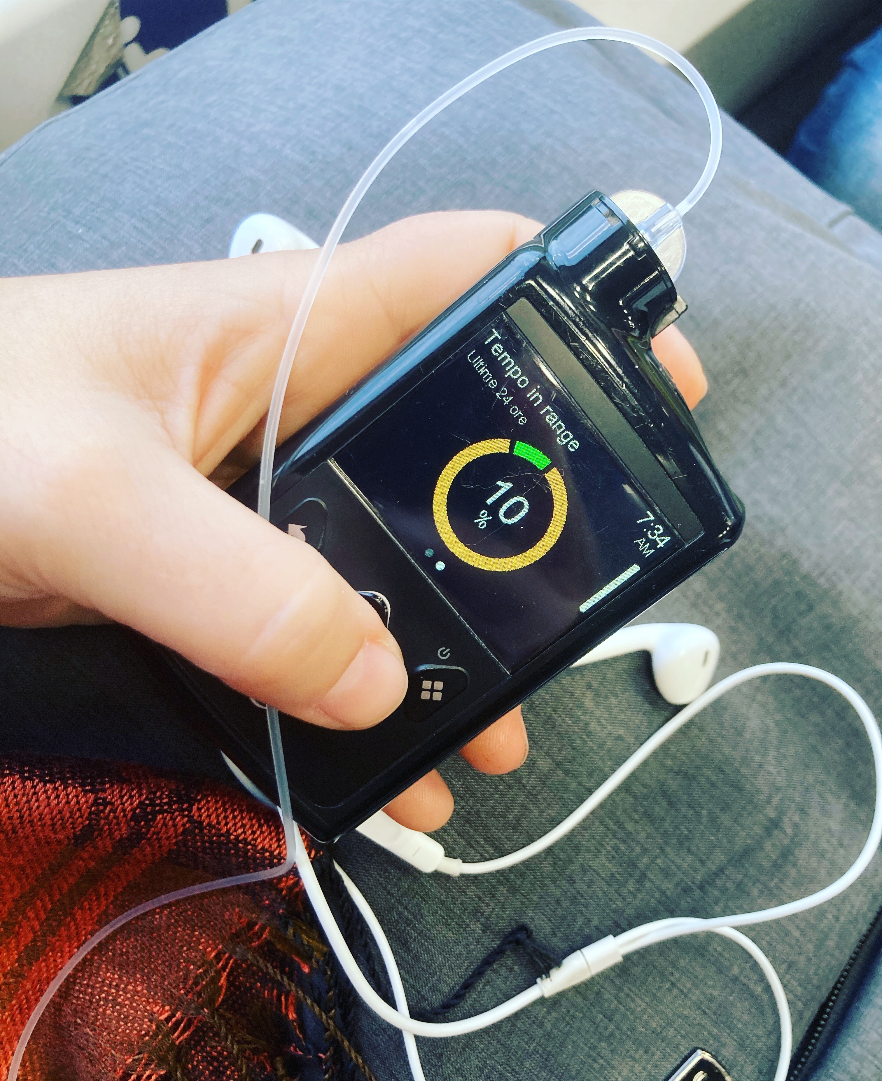 Il microP mi sveglia 15 min prima della sveglia ufficiale perché il sensore ha bisogno di una calibrazione. E quando misuro la glicemia dalla goccina di sangue dal dito, è quasi 200 mg/dL più alta di quello che dovrebbe, in parte anche a causa del piccolo intervento dal dentista di ieri sera e dalla super dose di anestesia necessaria. (Per una persona con il diabete come me il target ottimale è 110-130 mg/dL, ed il range entro cui è desiderabile che oscillino le glicemie 70-170 mg/dL, il così detto time-in-range… sopra o sotto questi valori, ed in altre situazioni, bisogna intervenire… e microP “suona”).