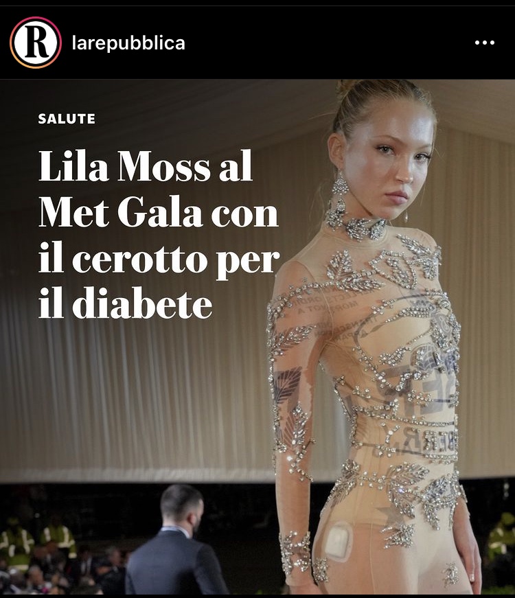 Mi concedo un po’ di quella leggerezza mattutina da pendolare dando un’occhiata ai social e trovo le immagini di Lila Moss, con il suo nude look, sensore e microinfusore. Allora rido!